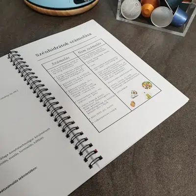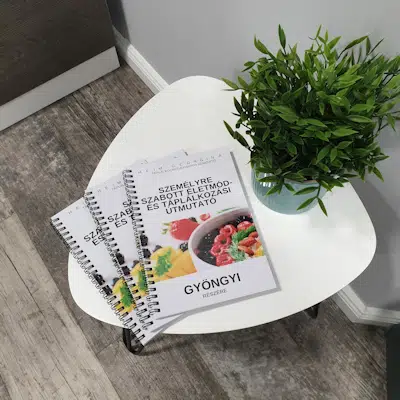 Életmód- és táplálkozási könyv: a konzultáció(k) és a dokumentumok visszaküldése után elkészítem a saját, rád szabott kb. 80 oldalas étrendi- és életmód könyvedet. Ezt Magyarország területén belül nyomtatott, spirálozott formában kapod meg. Ebbe a könyvbe jegyzetelhetsz, kiemelhetsz számodra fontos részeket, magaddal viheted a boltba. Külföldre automatikusan elektronikus formában kerül kiküldésre – amit akár te is kinyomtathatsz; vagy postai díj ellenében kikézbesítem számodra abba az országba, ahol élsz.